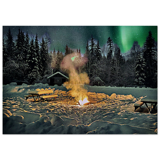 At the heart of this breathtaking tableau is a radiant bonfire, casting its warm glow against the frozen landscape. As you gaze upon the print, you'll feel the crackling warmth and hear the comforting whispers of the flames, defiantly challenging the 20 below temperatures that surround them.